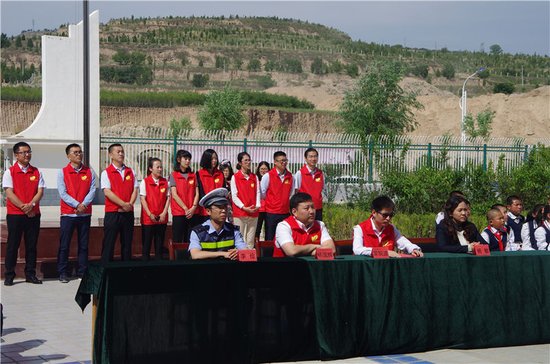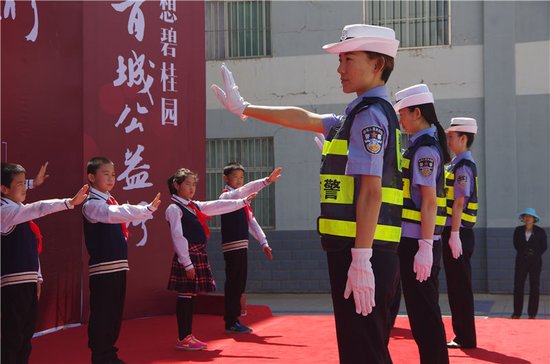 活动最后,杨敏校长,杨建斌警官,杨国辉先生,梁锐波先生共同浇灌满载着爱心地公益之树,预祝孩子们和树苗一样,能够茁壮成长,成为栋梁之才。定西市交警支队城区大队的宣传部干事也为孩子们宣讲道路安全知识,并亲自示范动作进行现场教学。