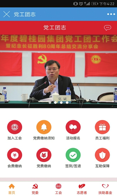 碧桂园“党工团志”手机APP具备在线缴纳党费、工会费,活动报名与签到、员工扶助基金捐款等功能,二期将新增在线“三会一课”功能,实现跨地域、跨时间推进党员教育培训以及党内组织生活,进一步强化集团党员管理;党员信息智能采集平台将党员管理与集团人力资源管理有机结合,结合党组织关系接转情况,系统自动生成在册、流动党员名单,实现系统动态维护管理;通过两个“碧桂园集团党员之家”微信群、组织委员工作群、党群办交流群,让各党支部畅通交流,让党务工作者、党员了解党建动态,共同学习党务知识;通过BGY党工团志服务号、BGY党群风采订阅号,宣传集团党委先进典型和工作经验,“抓两头带中间”,形成赶学比超良好氛围。