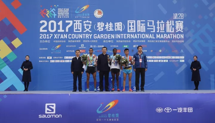 陕西省委常委、市委书记、组委会名誉主任王永康,市委副书记、市长、组委会主任上官吉庆,国家体育总局田管中心副主任蔡勇为男子全马获奖选手颁奖