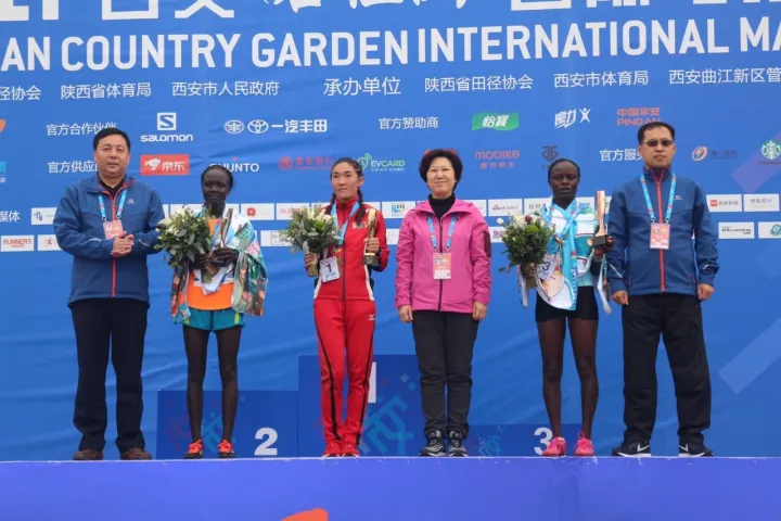 西安市体育局局长、组委会秘书长冯艳阳,碧桂园集团陕西区域总裁郭荣旺,西安市体育局副局长徐岗为女子全马获奖选手颁奖