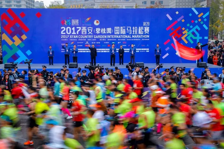 奔跑吧,西安!2017年10月28日西安首届(碧桂园)国际马拉松在千年古都西安鸣枪起跑。本届赛事由碧桂园总冠名,中国田径协会、陕西省体育局、西安市人民政府共同主办,以“阳光、向上、美丽、开放”为赛事总基调,共有来自亚、澳、欧、美等四大洲26个国家和地区的2万名运动员参赛,CCTV5进行全程160分钟现场直播,全国一百余家媒体、五百余名记者参与报道,这是西安迄今为止规格最高的体育赛事。