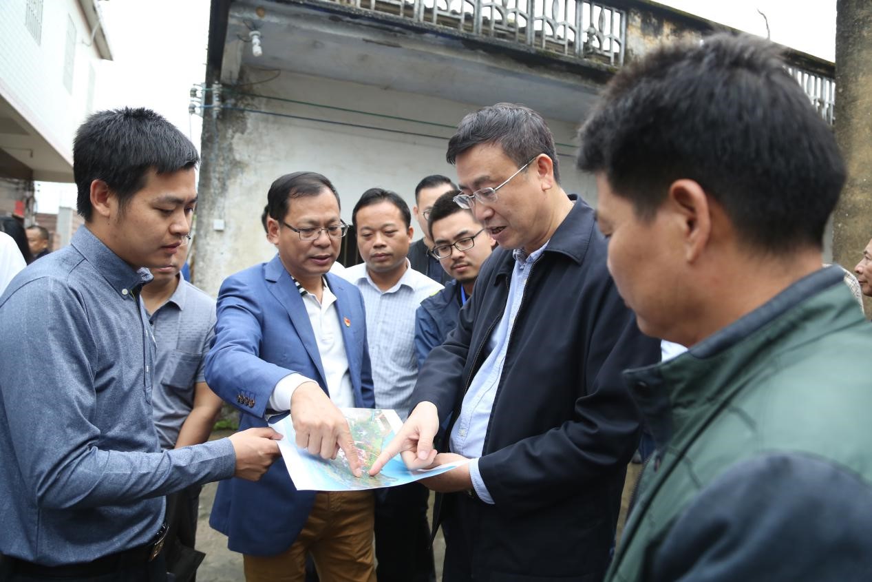 碧桂园集团助理总裁、社会责任部总经理、广东省国强公益基金会秘书长罗劲荣(左二)向陈祖煌(右二)介绍鱼咀村地图,探讨规划方案