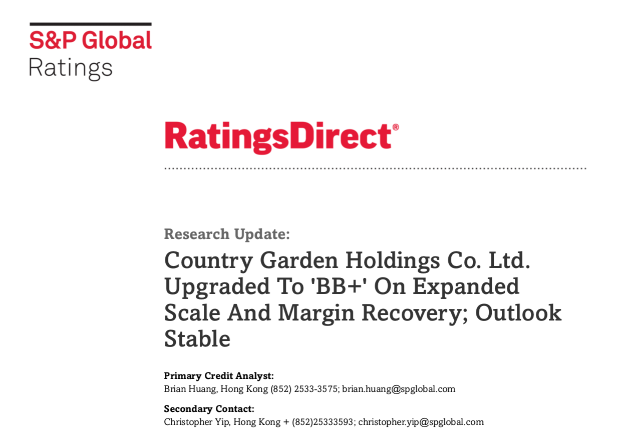 标准普尔评级(“标普” )指出, 基于扩张的规模,以及毛利率的回升,调升对碧桂园的企业长期信贷评级自”BB”至“BB+”,展望稳定。同时上调对优先无担保票据评级自“BB-”至“BB”。