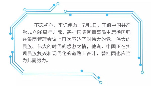 碧桂园集团党委书记、集团总裁莫斌表示,碧桂园始终以党建为引领,打造有社会责任感的企业文化,我们每一名党员,都要努力提高自身政治素养和文化修养,平衡好个人发展、服务企业和服务社会之间的关系,身为碧桂园的员工,都应“不忘初心,牢记使命”,勇敢地肩负起“希望社会因我们的存在而变得更加美好”的企业使命。