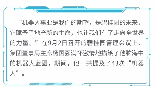 “我们生逢其时,刚好碰到了这个伟大的年代。”杨国强说,机器人经历了很漫长的人类研究,到今天很多技术都已经具备,市场巨大,效益巨大。在他看来,机器人事业是碧桂园的未来,赋予了地产新的生命,也让碧桂园有了走向全世界的力量。