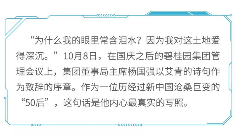 “真的很感恩伟大的祖国、伟大的党。”杨国强常说,要敬畏党、国家和民族,并爱之。在他看来,如果没有伟大的党,我们国家就很难真的站起来;如果没有国家的强大,就没有碧桂园的今天。