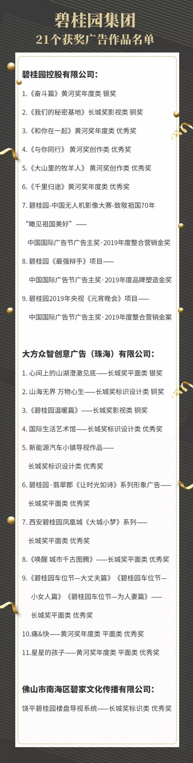 其中获长城奖银奖1项、铜奖3项、优秀奖7项;获黄河奖银奖1项、优秀奖6项,创下历年来最佳成绩。碧桂园集团推出的公益广告片《奋斗》荣获本届广告节黄河奖年度银奖。