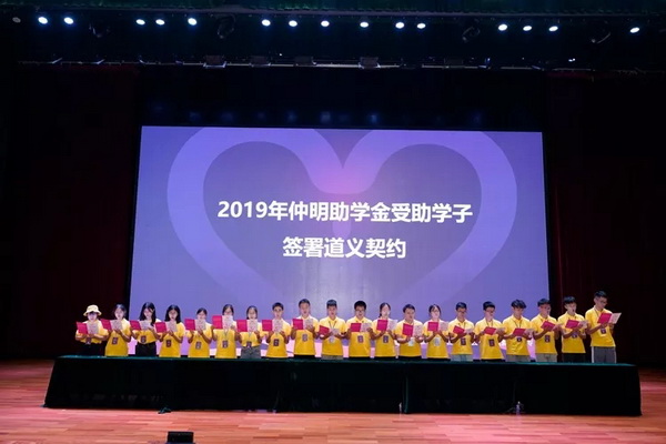仪式上有一个特别的环节,2019年的获助学生代表走上舞台,庄重地签署了《仲明助学金道义契约》。