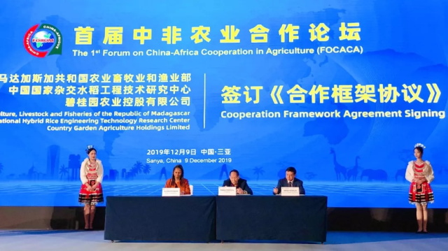 12月9日,在海南三亚召开的首届中非农业合作论坛上,碧桂园集团副总裁兼碧桂园农业控股有限公 司 总 裁 梅永红与马达 加 斯加共和国农业、畜牧业和渔业部 总 司 长RAHARINOMENA Fanjaniaina Miharisoa,中国工程院院士、国家杂交水稻工程技术研究中心主任袁隆平,共同签订了三方农业合作框架协议,将共同合作推动杂交水稻在马达加斯加共和国的产业化发展。