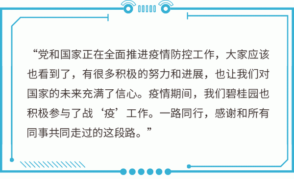 自疫情发生以来,碧桂园集团及下属132个单位迅速成立了防疫应急领导小组,由集团总裁莫斌担任集团防疫领导小组组长,严格执行多级党委政府疫情防控要求,帮助业主、客户和员工进行有效的防疫工作。1月24日除夕夜以来,碧桂园累计捐赠2亿元设立新型冠状病毒感染肺炎疫情基金,出钱出物出力,结合企业优势和疫情所需,探索了行之有效的抗疫之路。同时,集团19万员工听指挥不聚集不添乱,无发生一例员工聚集性感染事件。