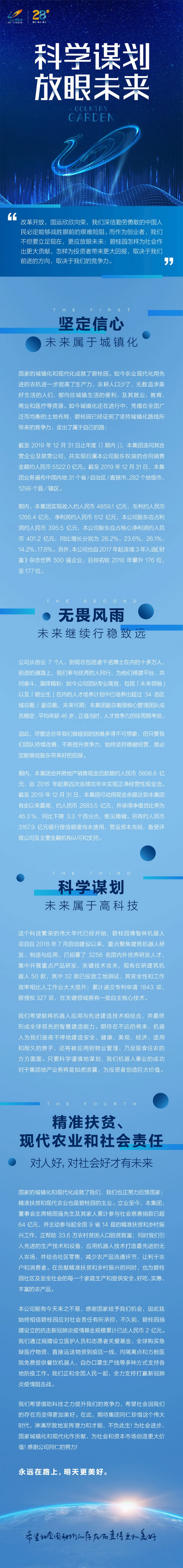 · 截至2019年12月31日止年度,本集团连同其合营企业及联营公司,共实现归属本公司股东权益的合同销售金额约人民币5522.0亿元,归属本公司股东权益的合同销售面积约6237万平方米,同比分别增长10.0%和15.2%。
