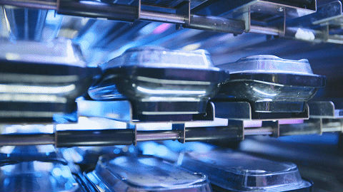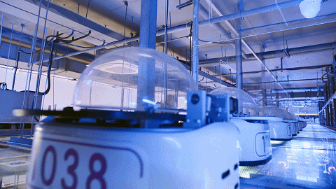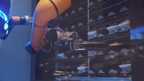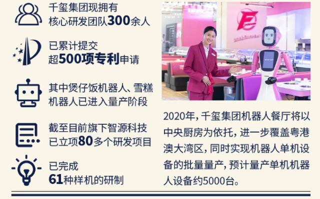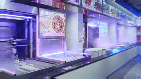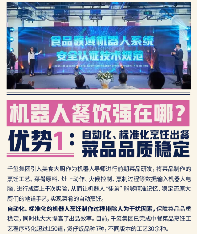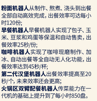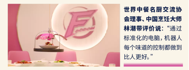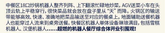 中餐区18口炒锅机器人整齐列阵、上下翻滚忙碌地炒菜,AGV送菜小车在头顶云轨上平稳穿行,很快菜品就会放在盘子里从“天”而降。火锅区的输送带能够高效、快速、准确地把菜品输送至对应的餐桌上。