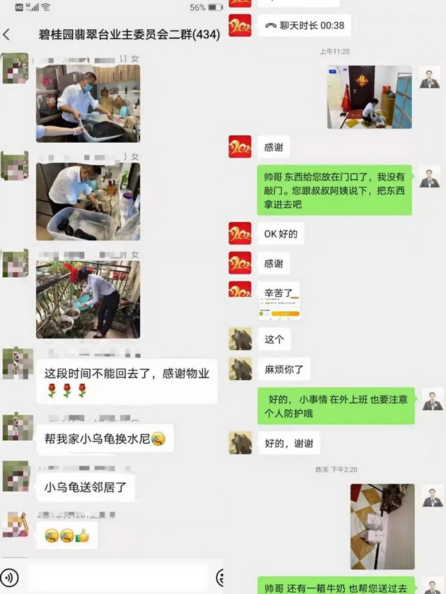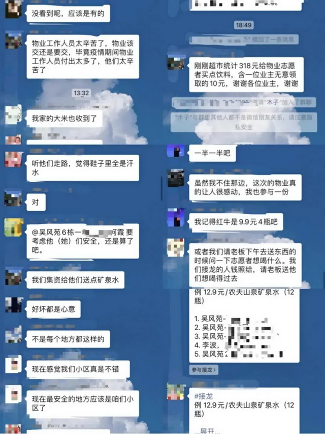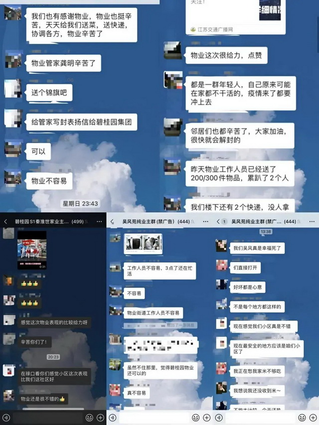 江苏碧桂园各小区的物业24小时值守在防疫第一线,敬业的工作精神感动不少业主。许多暖心的业主在群里自发组织缴纳物业费、组团送物资慰问在岗物业工作人员,邻里间互相支持,共渡难关。