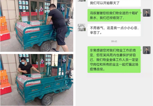 业主冯先生通过网购的方式给小区物业工作者购买了十箱矿泉水。他感激地说:“疫情开始到现在,你们始终辛苦地奔走在一线,感谢有你们,辛苦了!”