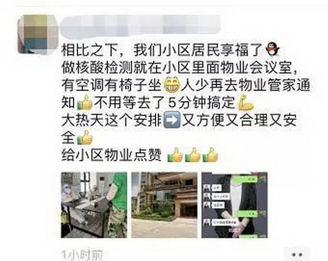 有业主特地发朋友圈为物业点赞:“物业将自己的会议室腾出来,给我们做核酸检测,又方便又安全。”