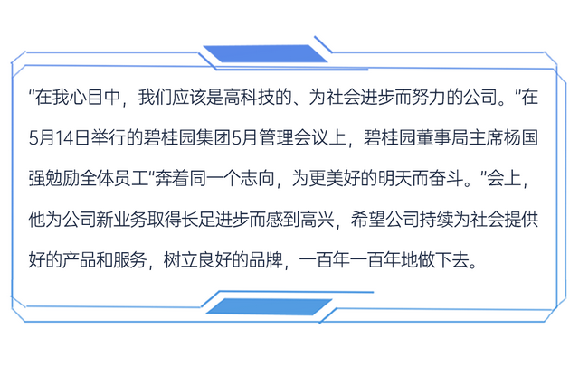 杨国强在会上重点强调,碧桂园要为所有追求好生活的人提供好产品、好房子,要时刻关注品质品牌、质量、装修、物管、绿化等方方面面。“公司要一百年一百年地做下去,就一定要有很好的品质和信用体系,要真正树立良好的品牌。”