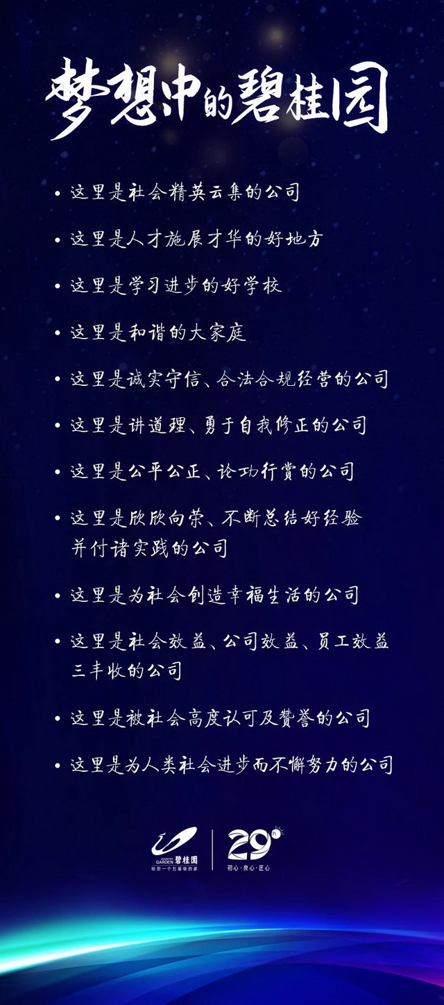 在今年2月的月度管理会议上,杨国强深入解读了碧桂园的企业文化,一共7条:守法;爱党爱国家;为社会的进步而努力;只有真理才能在公司横着走;任人唯贤;和有大贡献的人分享;永远在学习进步。