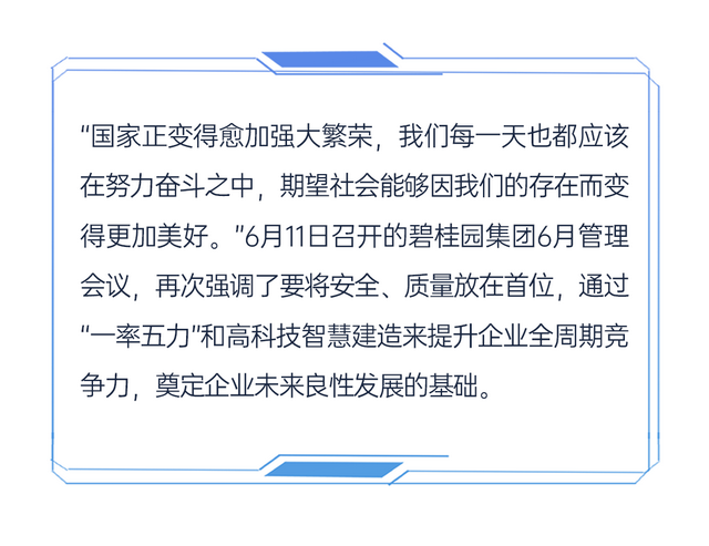 最近这两年,“一率五力”在碧桂园内部被频繁提及。集团强调要始终坚持业主的口碑至上,坚持长期主义;坚持资金高效率、运营高效率、组织高效率;坚持在不浪费的前提下提升品质;坚持严格的标准化和强基行动。只有好的产品和服务,才能奠定企业良性发展的基础。