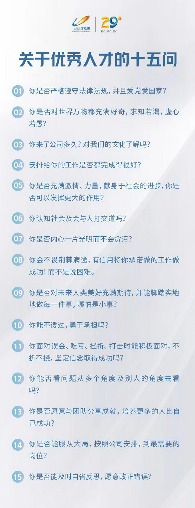 他表示,此次招募选拔不论学历,重要的是对他提出的15个问题的思考和认识,择优录取来培养碧桂园的“高级将领”。这些问题包括“你是否热爱党和国家?”“是否对世界万物充满好奇?”“对公司的企业文化了解吗?”等等。