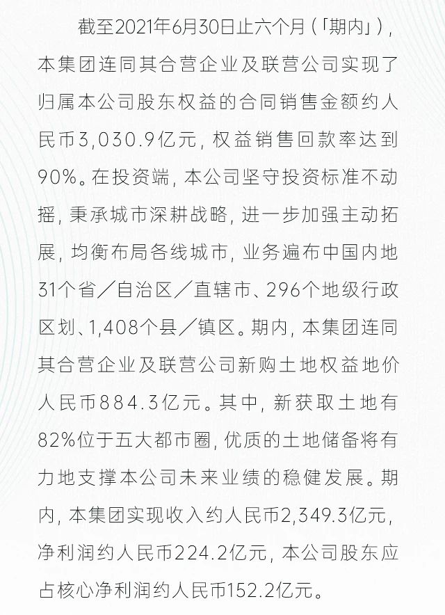 · 截至2021年6月30日止六个月,本集团连同其合营企业及联营公司,共实现归属本公司股东权益的合同销售金额约人民币3,030.9亿元,归属本公司股东权益的合同销售面积约3,451万平方米,同比分别增长14%和8%。期内,权益回款率达到90%。