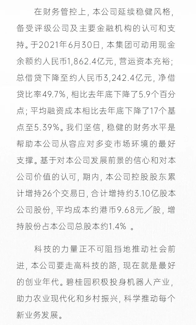 · 截至2021年6月30日,本集团总借贷下降至约人民币3,242.4亿元,净借贷比率49.7%,相比去年底下降了5.9个百分点,加权平均借贷成本为5.39%,相较2020年12月31日下降了17个基点。