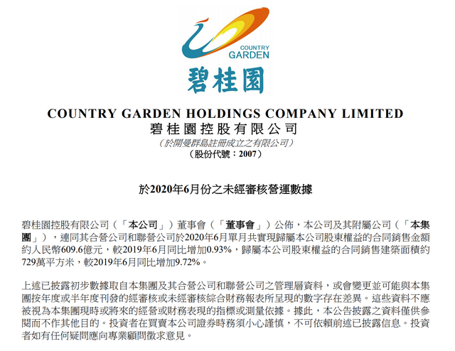 7月1日,碧桂园发布公告称,6月实现权益合同销售金额约609.6亿元,同比增长0.93%,权益合同销售建筑面积约729万平方米。而第三方研究机构公布的全口径统计显示,碧桂园销售业绩仍稳居行业首位。