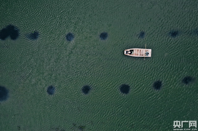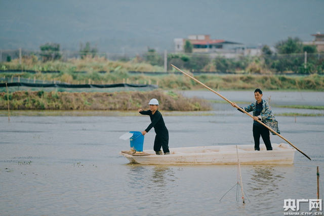 养殖户乘坐小船驶过稻虾田。(央广网记者 官文清摄)