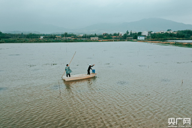 养殖户正在投喂虾食。(央广网记者 官文清摄)
