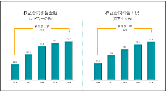 2020年财报显示,碧桂园实现权益合同销售金额约5706.6亿元,同比增长3.3%;权益合同销售面积约6733万平方米,同比增长8%。统计显示,2016年至2020年期间,公司权益合同销售金额复合增长率达到25%。在竞争激烈的市场环境下,公司销售体现出很强的韧性,连续多年保持行业第一的市场地位。