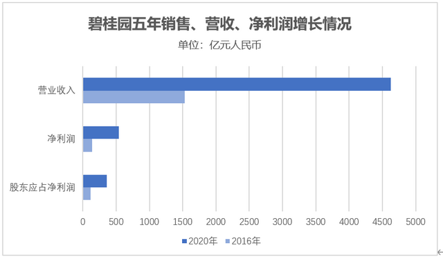 此外,自2016年至2020年,碧桂园营收从1530.9亿元增长至4629亿元,涨幅达202.4%;净利润从136.6亿元增长至541亿元,涨幅达296%;股东应占净利润从115.16亿元增长至360.2亿元,涨幅达212.8%。几项业绩指标均表现不俗。