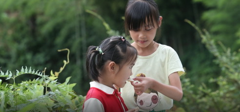 江西省兴国县郑枫村张瑞珍两个女儿品尝自家蜂蜜
