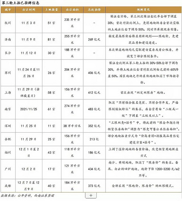 首先,多城放宽参拍门槛。在全国第三次集中供地,南京放宽了参拍房企的资质要求;苏州将出让地块的保证金比例全部下调至30%;广州在部分地块取消“限房价”要求,总价允许最长六个月内付清。