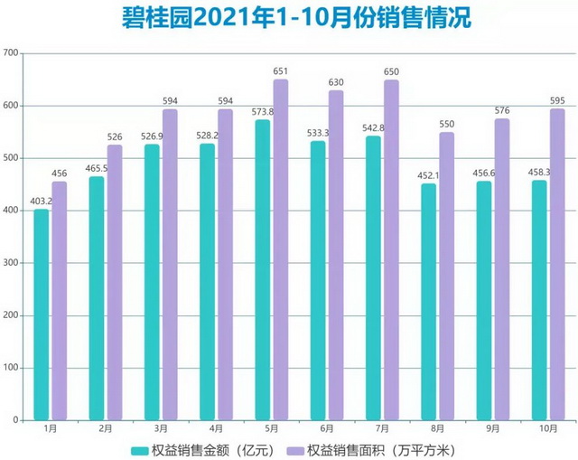 在销售端,2021年前10月,碧桂园累计权益合同销售面积5822万平方米,累计实现权益销售金额约4940.7亿元,在房地产市场销售整体降温下,展现出较强的韧性。